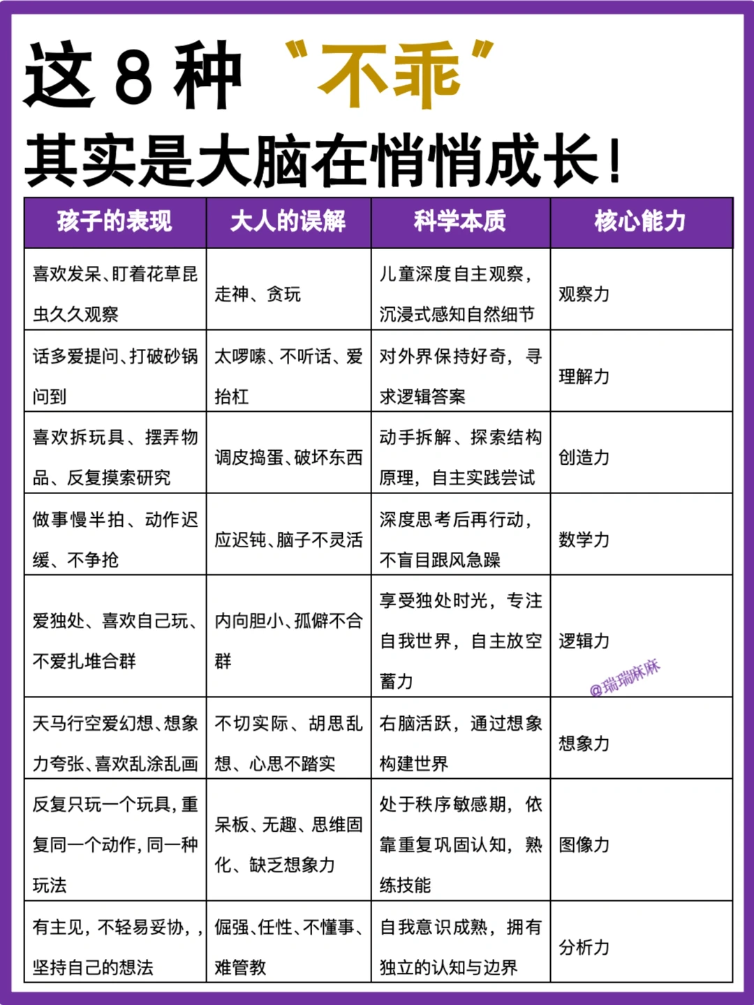 但孩子真正的聪明,[飞盘R]从来不是“提前学会多少”,而是内在的底层能力:是强烈的好奇心、敏锐的感知力、灵活的思维力、稳定的情绪力,以及大脑高效的学习潜能。[氛围感R]这些看不见的能力,才是未来学习、创造、解决问题的核心,而作为家长,在宝宝0-3岁的时候建议做到: