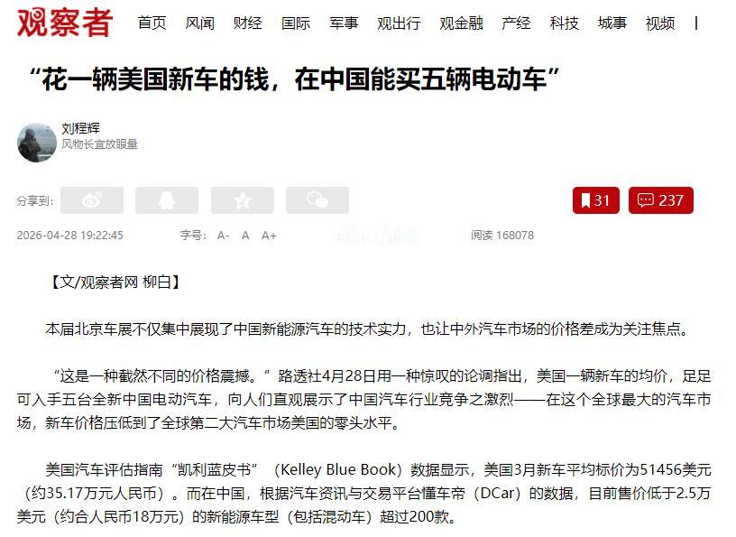 最近有个事儿,连国外媒体都看呆了。路透社4月28号报道:美国一辆新车的均价,足足可入手五台全新中国电动汽车,向人们直观展示了中国汽车行业竞争之激烈——在这个全球最大的汽车市场,新车价格压低到了全球第二大汽车市场美国的零头水平。