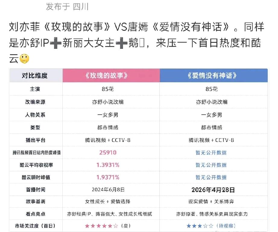 因为她俩都是85🌸,拍的都是亦舒的都市剧,剧情都是围绕着一女多男展开,播出平台都是央8+腾讯。