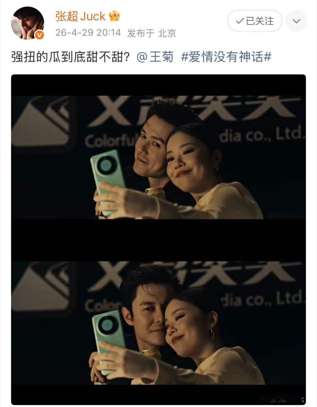 王菊张超剧宣关系强扭的瓜 张超问甜不甜,王菊说听我的。这波剧宣互动太会了!《爱情没有神话》里他俩的关系完全不走寻常路,强势靠近遇上反向拿捏,每一场对手戏都充满张力。传统都市剧的套路被彻底打破,这对强扭的瓜我先嗑为敬。爱情没有神话