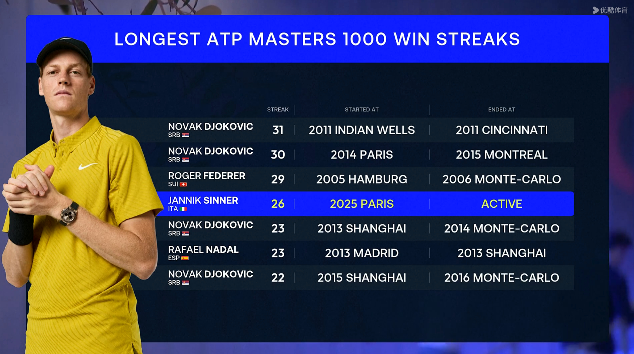 世界第一6-2/7-5艰难拿下了西班牙新星,取得了大师赛26连胜,首次在马德里闯入四强!整场比赛挽救了全部7个破发点,第二盘第六局和第八局是本场精华,辛纳两次在15-40落后情况下保发。