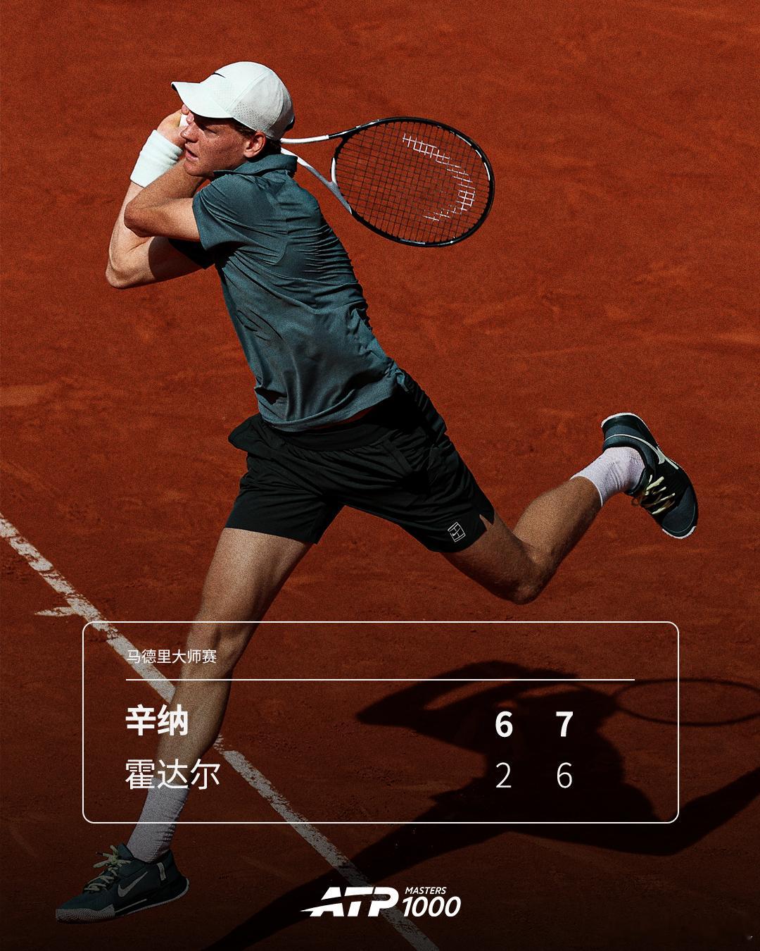 ATP1000 马德里大师赛男单1/4决赛,头号种子辛纳挽救全部7个破发点,以6-2 7-6(0)击败本土小将霍达尔,职业生涯首次闯入马德里半决赛,豪取巡回赛21连胜、大师赛26连胜。接下来,他将静候菲斯与莱赫卡之间的胜者。
