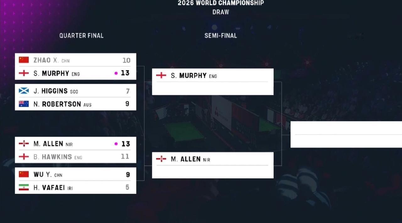 世锦赛四强之争进入白热化,继小钢炮马克·艾伦第一个闯入4强,世锦赛1冠三亚,2005世锦赛冠军,13个排名赛冠军大嘴肖恩·墨菲以13-10击败2025年世锦赛冠军,红包赛三冠王(大奖赛,球员锦标赛,巡回锦标赛),6个排名赛冠军中国选手赵心童,闯入4强。