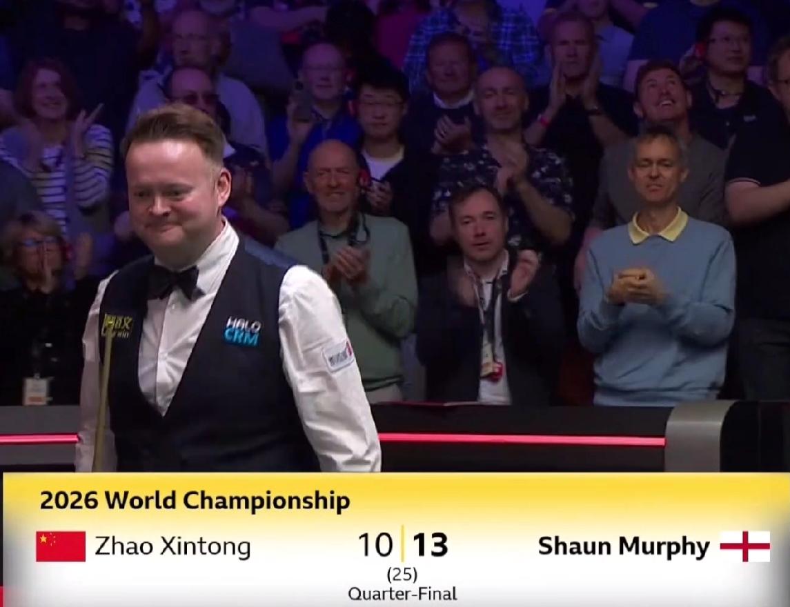 随后赵心童一杆长台上手,单杆81分扳回一局,挽回一个赛点,可在随后的一局中,赵心童进攻中袋失误,肖恩·墨菲打超大角度中袋上手,单杆69超分,台面还有67分,赵心童反击晕进红球,打了30分后防守,但防守未成功,最终肖恩·墨菲以13-10战胜世锦赛卫冕冠军赵心童,晋级世锦赛4强。