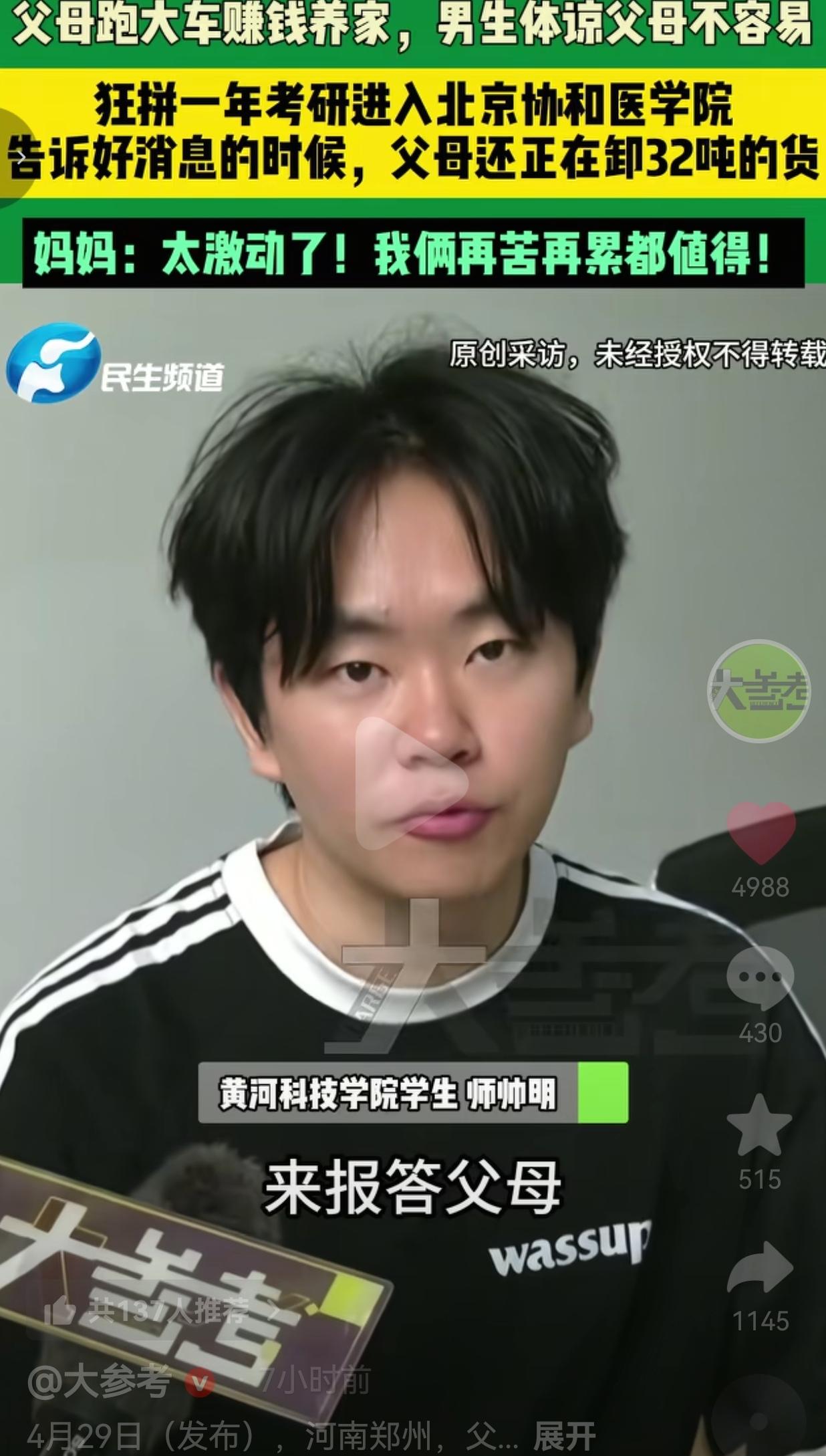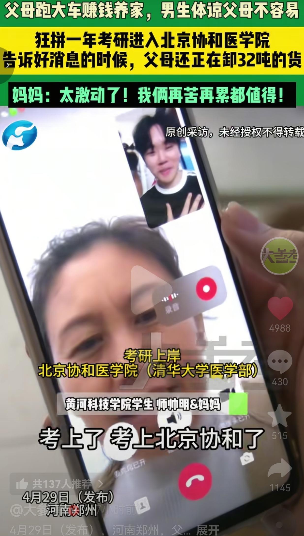 父母卸32吨货时,他电话里报喜考上协和医学院,这声“上岸”听哭了多少人 河南