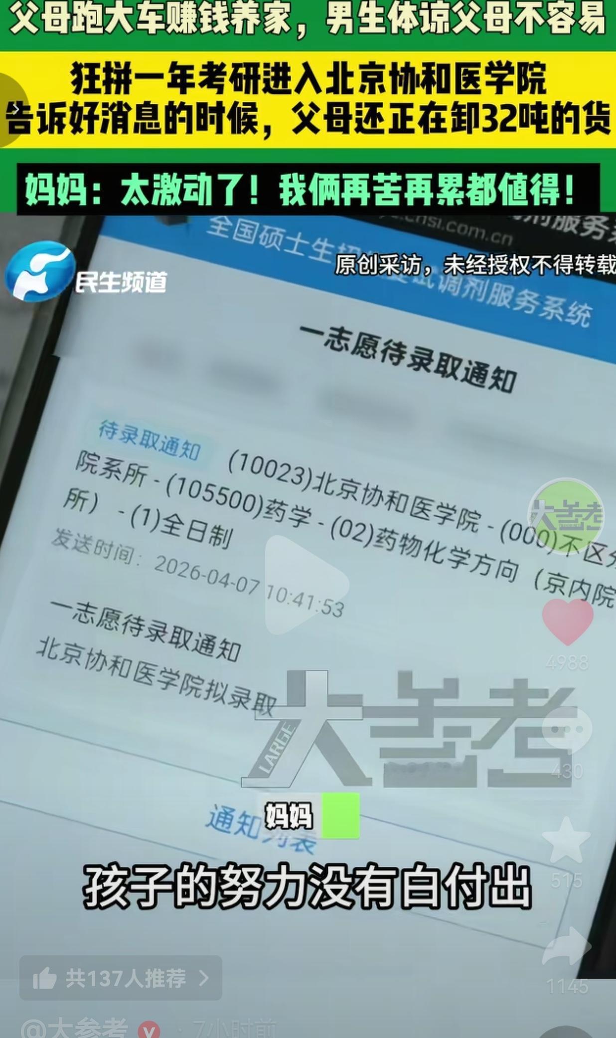 父母给不了优渥家境,只能靠跑大车、卸重货,用一身力气给孩子撑起一张安稳书桌;孩子从不抱怨出身,默默埋头苦读,把父母的汗水和期盼,硬生生熬成了协和医学院的录取通知书。
