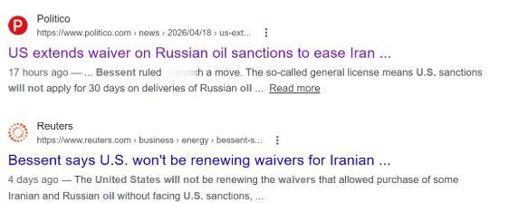 美国政府决定将俄罗斯石油的豁免令再延长30天。
