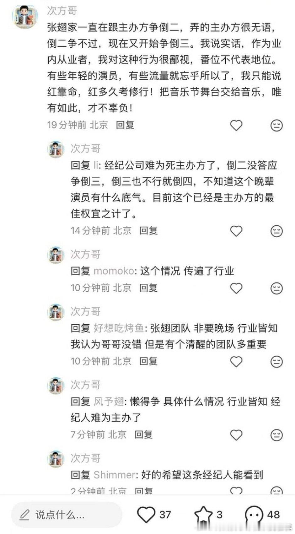 音乐节争番位也是愈演愈烈了,先是黄子争压轴,没争到争了个倒二,现在我瑞的短男张翅也要争倒二,争不到就争倒三倒四名气不大谱挺大