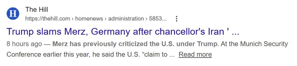 德国总理默茨周一在一场演讲中批评大统领,认为美国在缺乏正当理由以及必要战略的情况下发动美以伊战争,然后被伊朗羞辱(《伊朗溜特朗普》)。大统领暴怒,在社交媒体骂默茨、骂德国。