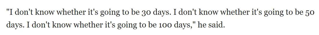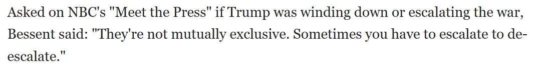我们只是选择承受50天的临时性价格上涨,之后价格就会回落,换来的是50年没有伊朗政权拥有核武器的局面……我不知道这会持续30天,还是50天,还是100天……(逐步降级战争和升级战争并不矛盾)有些时候你为了降级局势必须先升级局势。