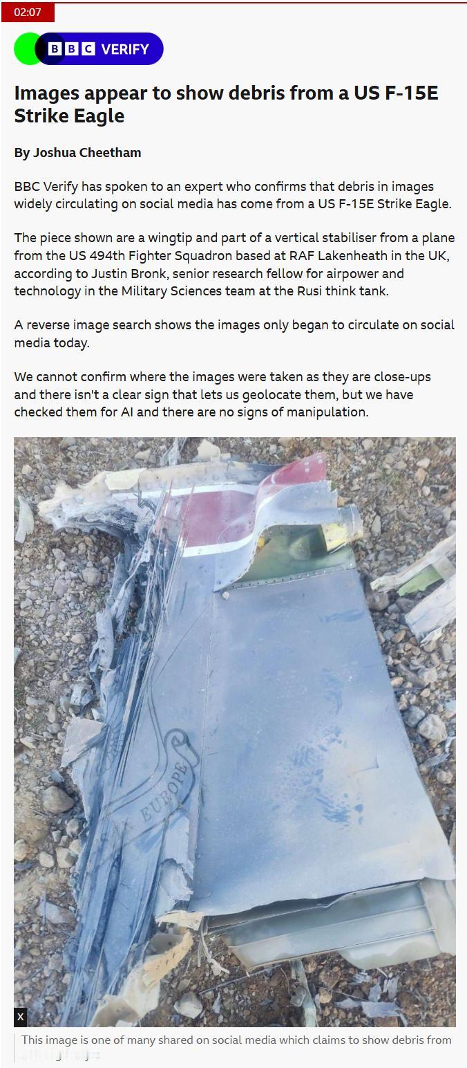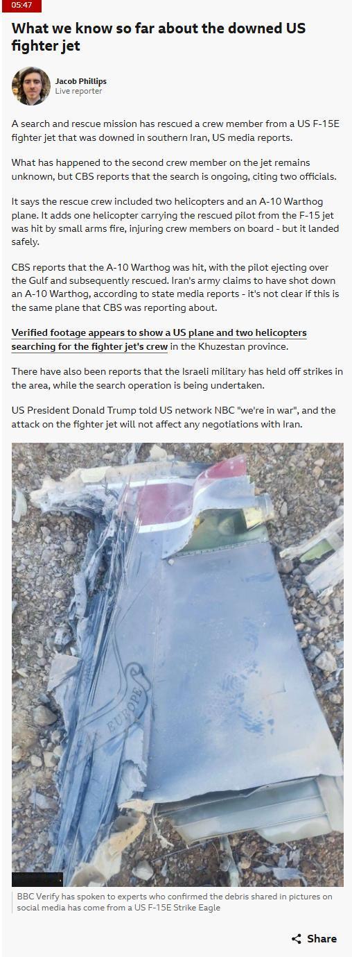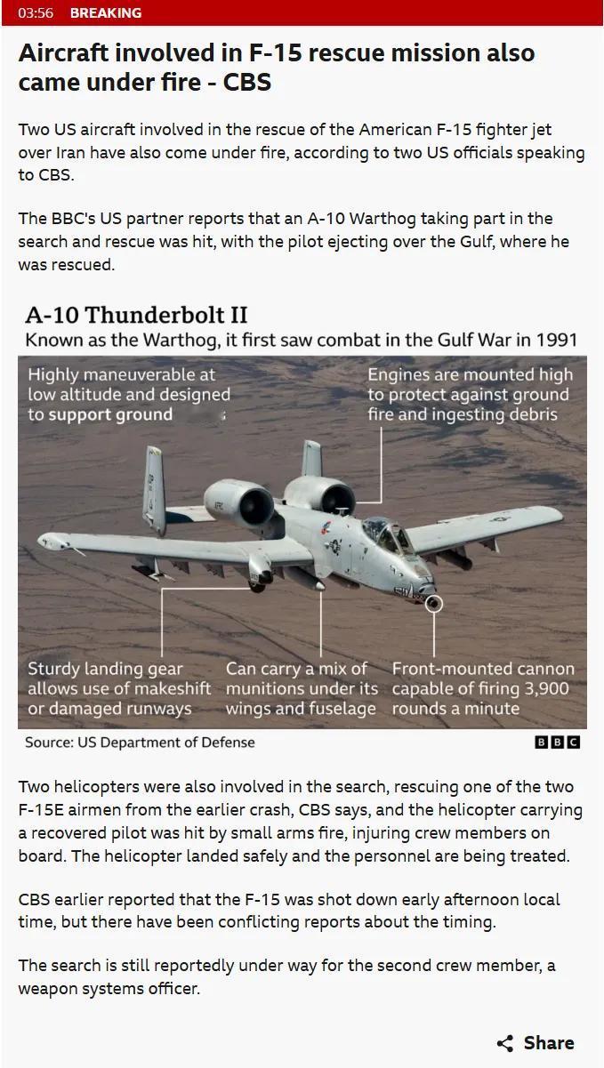 伊朗宣称打下了一架美军F-35战斗机,并发布了照片,随后被证实打下的是执行轰炸任务的F-15。为了救飞行员,美军派出两架搜救直升机和一架A-10攻击机。两架直升机被击中,其中载着获救F-15飞行员的直升机机组成员受伤,据说两架直升机都成功降落。但随后CBS报道A-10攻击机被伊朗打了下来,A-10飞行员弹射并获救,伊朗方面也宣称打下了当天第二架美军飞机,BBC尚未能核实CBS报道的被击落A-10与伊朗宣称的战果是否为同一架飞机。