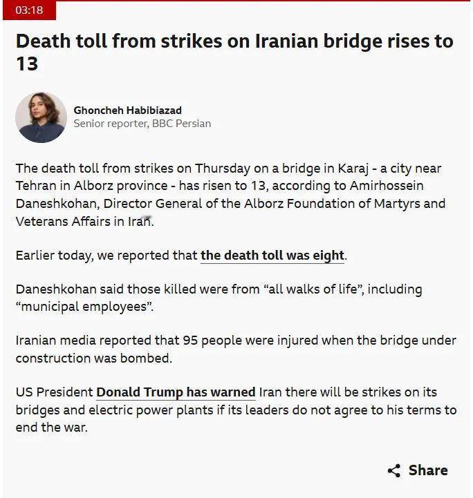 大统领炫耀的轰炸伊朗民用大桥任务,平民死亡已经升至13人。