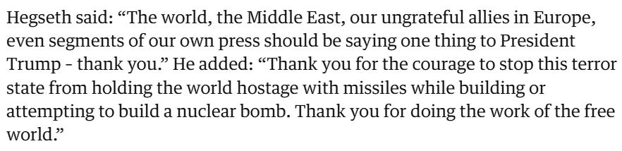 全世界、中东、我们在欧洲那些不知感恩的盟国,甚至我们自己的部分媒体,都应该对特朗普总统说一声“谢谢”——谢谢您用勇气阻止了这个恐怖国家在制造或试图制造核炸弹的同时用导弹绑架全世界。谢谢您替自由世界完成了这项工作。