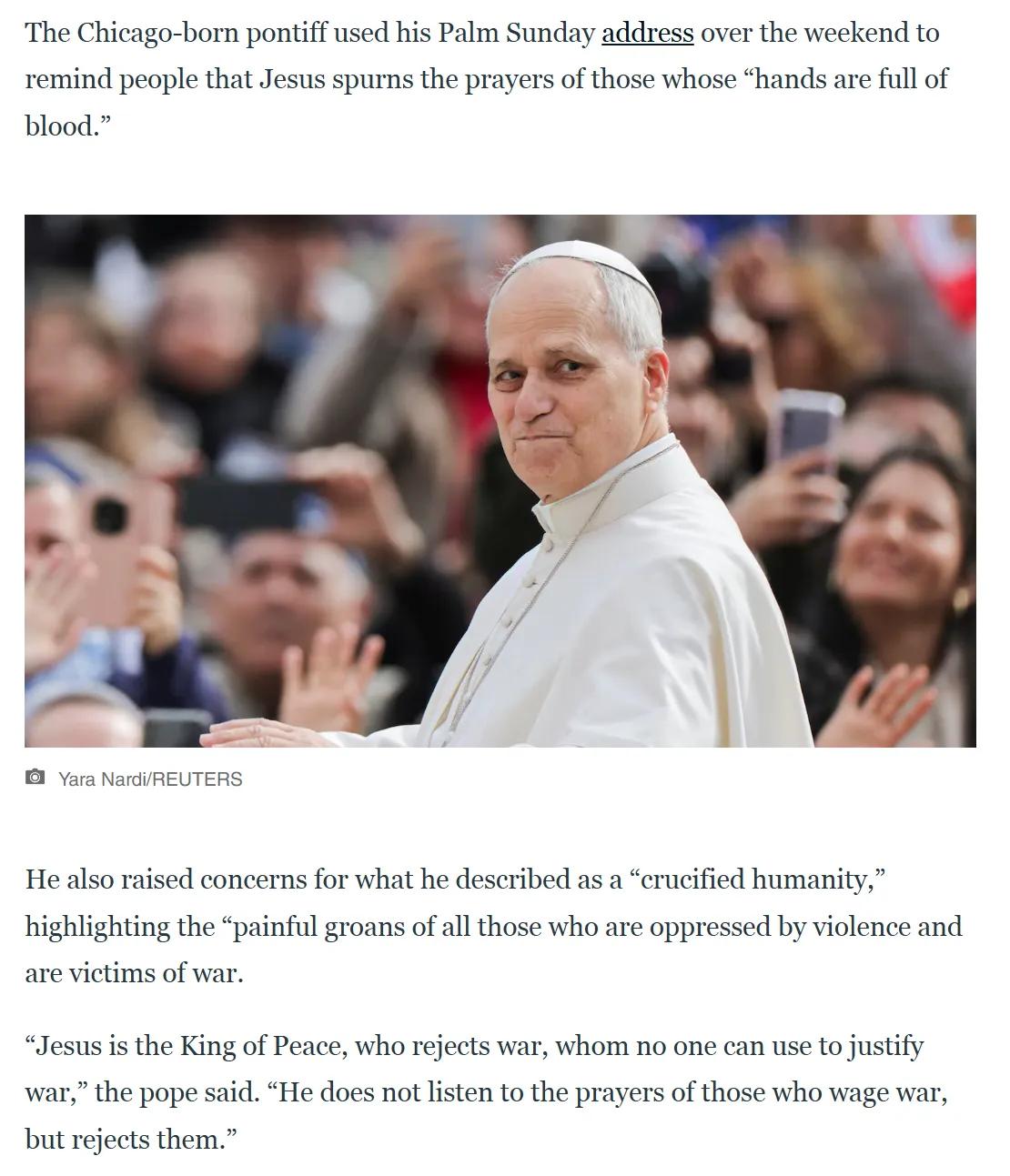 大统领和黑格赛斯鼓励美国老乡们为参与美以伊战争的美国大兵们祈祷(《“美国人民请每日屈膝祷告”》),美国籍教皇利奥十四世不点名地斥责两人利用上帝名义发动战争,表示“上帝不会听那些双手沾满献血之人的祈祷”(《内塔尼亚胡疯狂操作越来越多,“美国反犹主义正在成为主流”》),白宫新闻秘书Karoline Leavitt回怼教皇,强调美国大兵们对大统领等人的感激之情。