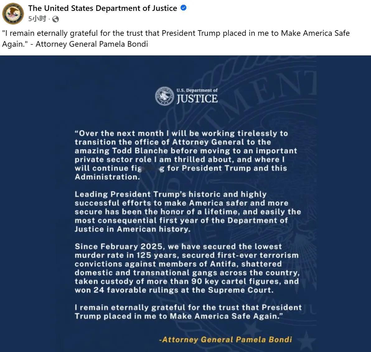 此前外界普遍猜测战争部长黑格塞斯可能成为美以伊战争的背锅侠,成为大统领2.0政府第三位出局的内阁成员。没有想到却是Pam Bondi。