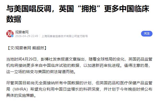 4 月 29 日彭博社报道,MHRA 首席执行官劳伦斯・塔隆直言不讳:继续拒绝中国数据,只会让西方错失最具前景的新药研发机会,这份警告背后,是英国加速抢占全球医药创新高地的雄心。