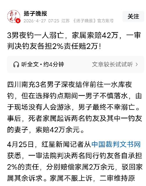 “冤不冤?”四川南充男子夜钓不幸溺亡,死者家属以42万元起诉同行的夫妻和钓友,引发网络舆论两极分化。舆论热点不仅在于是否“讹诈”,还涉及夜钓活动的安全教育缺失以及法律对“同伴关系”注意义务的认定。法院最终判决只承担极小比例的赔偿,既保留了家属的慰藉,也为类似野外活动敲响警钟。