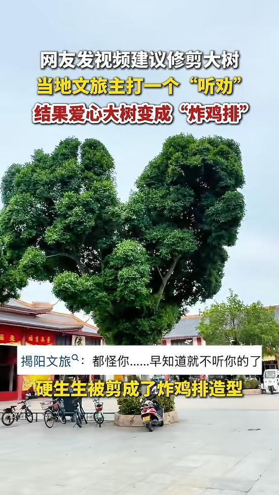 “笑不活了!”4月28日报道,广东揭阳,一男子发现一棵大树的形状像爱心,建议修建成“爱心树”,打造一个新的打卡点,当地文旅主打听劝,迅速动工修建,不料却剪成了大鸡排形状,却意外出圈!网友:没人能逃过Tony,树也一样!
