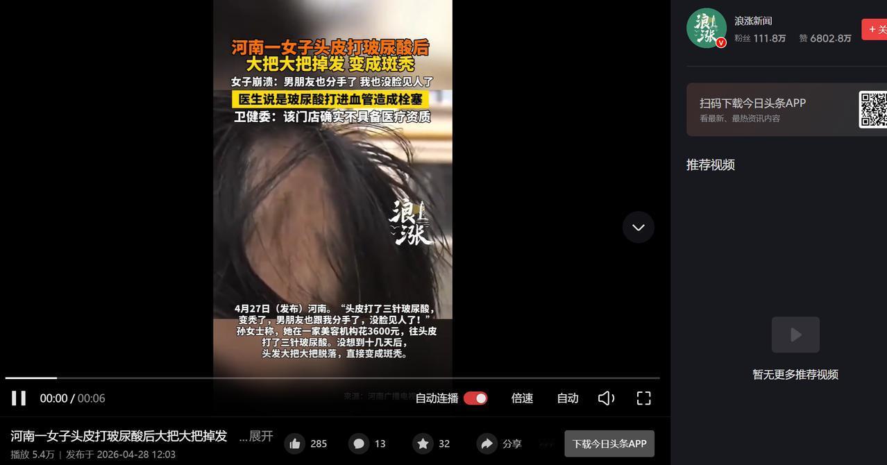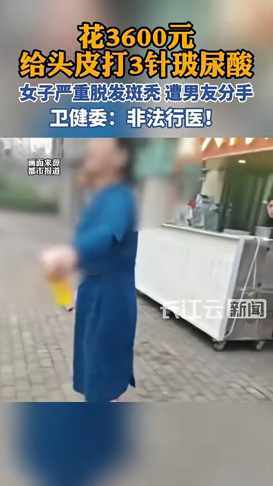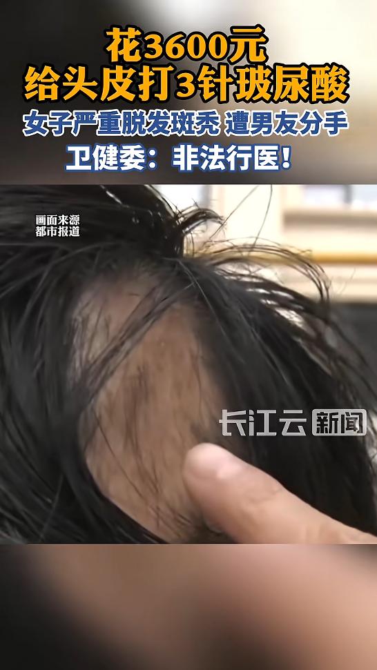 (信息来源:《花3600元给头皮打3针玻尿酸,女子严重脱发斑秃,遭男友分手》长江云新闻)