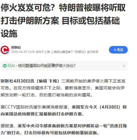 美伊博弈的下半场,真的要开始了?4月30日最新重磅爆料,美军针对伊朗的“短促而猛烈”打击计划已经全部制定完成,特朗普已经在仔细阅读这个打击计划!