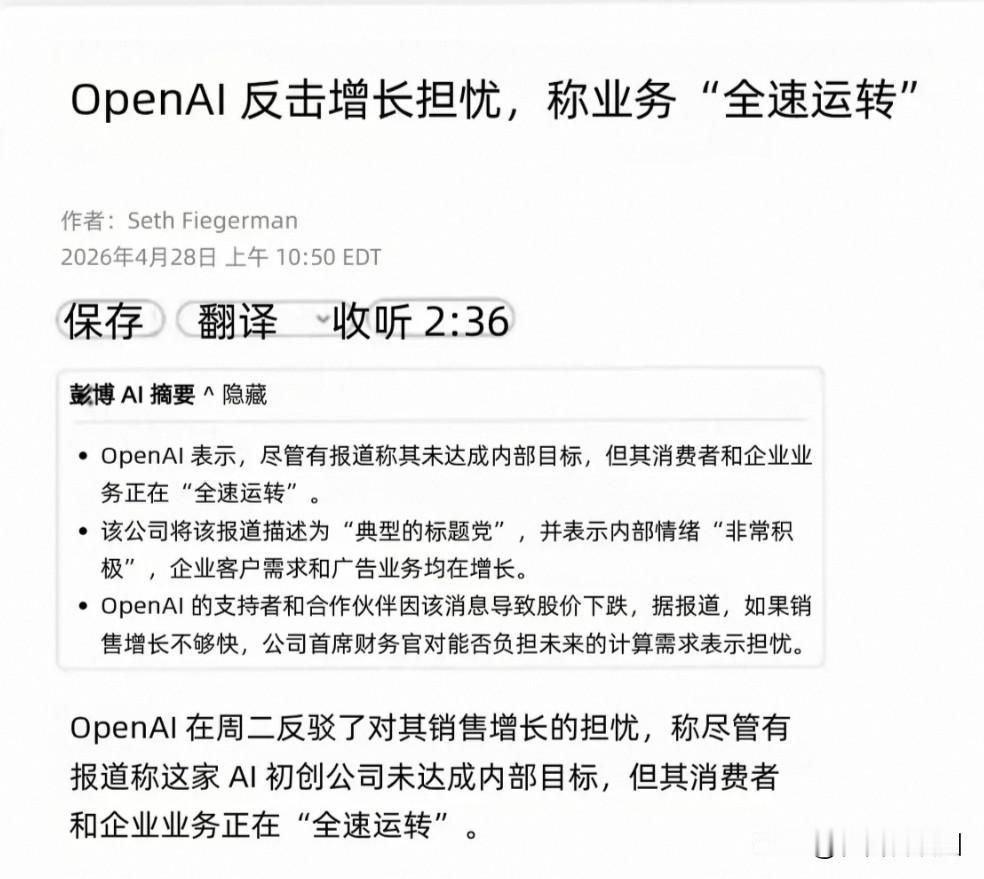 据彭博社报道,当地时间4月28日,AⅠ公司针对外界对其销售增长的担忧作出回应,称其消费者和企业业务正“火力全开”,并将相关媒体报道斥为“标题党”。