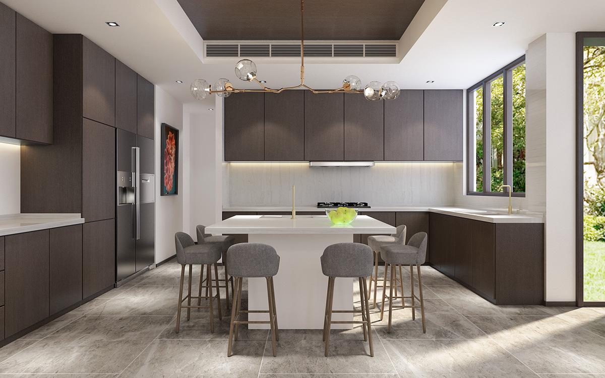 开放式的厨房中央还做了环形岛台,周边摆放长脚椅子,适合人不多的时候在此用餐,朋友多的话还是外面的餐厅合适。L形的橱柜和内嵌式的厨房家电都是高级感满满。