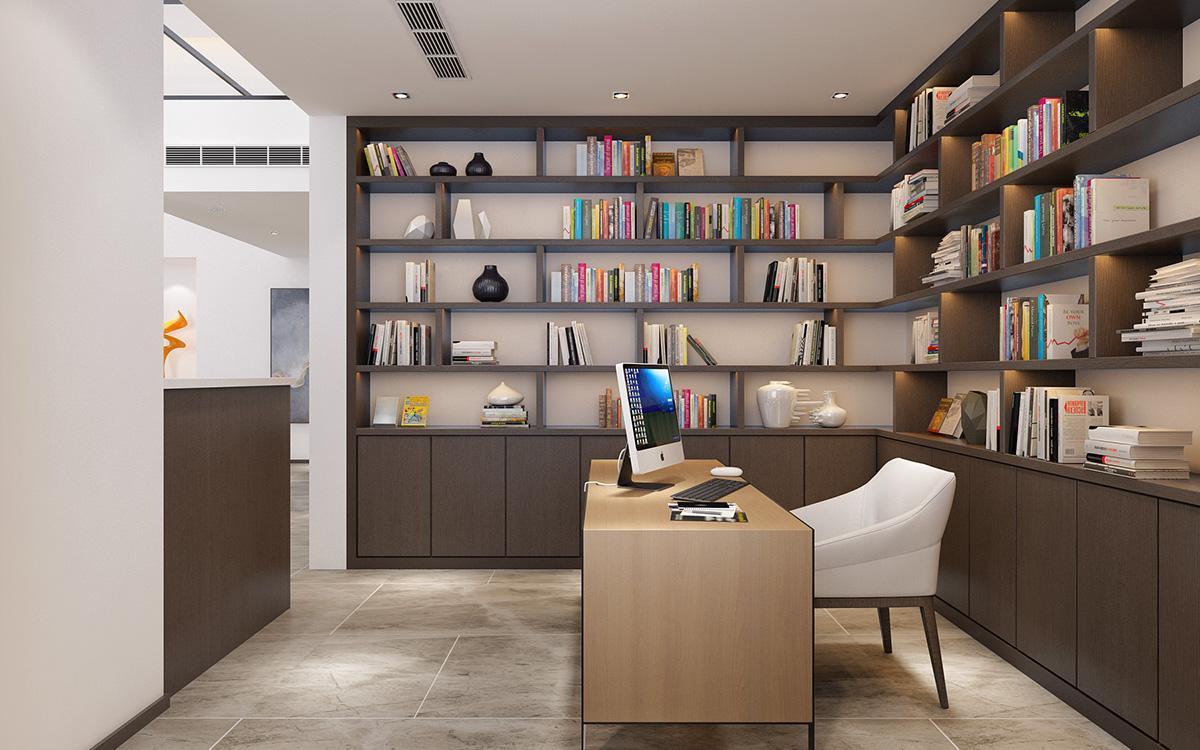 书房的设计是考虑到一定私密性的,在书房门口做了一个隔断,方便屋主更好的办公。两面墙都做通顶的书柜,虽然增加了大量的储物空间,但是后期打理起来可能会不太方便。