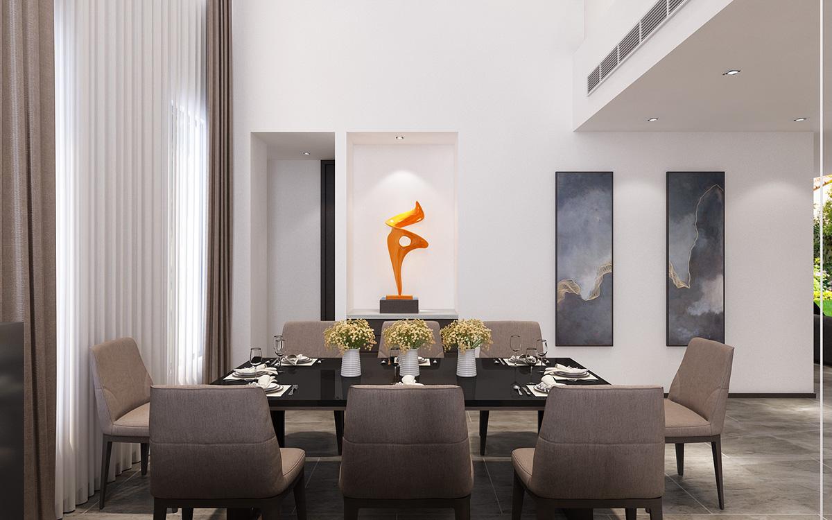 客厅另一边是餐厅,同样是双层挑高,上方采用全屋中央空调,简约的方桌和绒面的椅子,这部分空间没有特别出彩的地方。