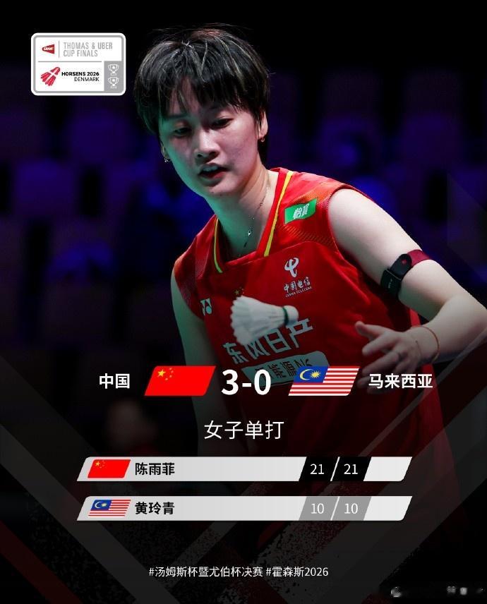 直播吧4月30日讯北京时间今天下午进行的2026羽毛球尤伯杯1/4决赛,中国3-0马来西亚,晋级半决赛。