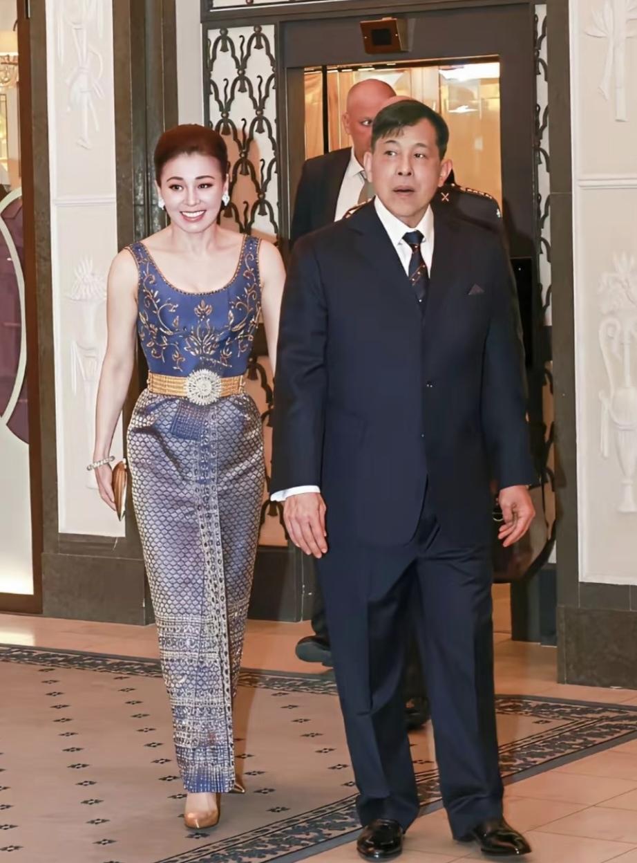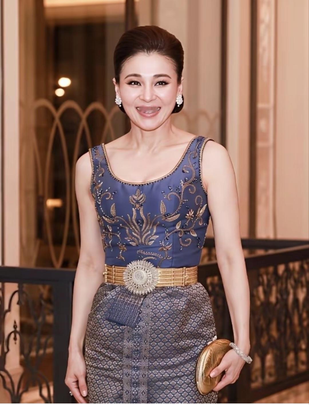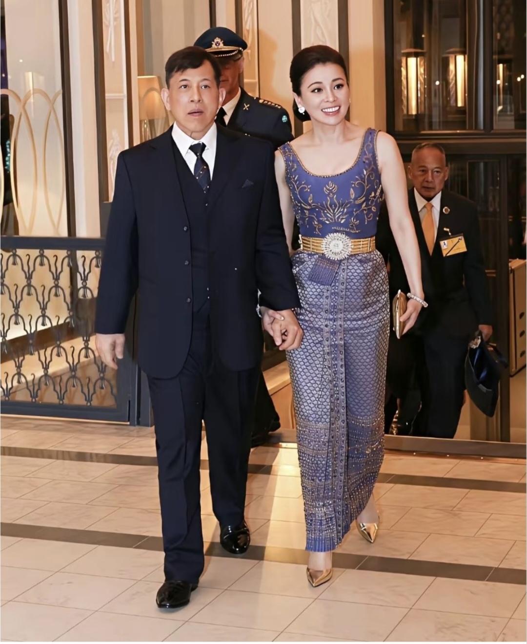 苏提达晚宴新造型太惊艳了!4月29日,苏提达王后跟随泰王出席瑞典王室非正式晚宴,蓝金刺绣无袖上衣,下面是泰式裙子,金色手包一搭配,那是精神抖擞,既明艳又时尚。