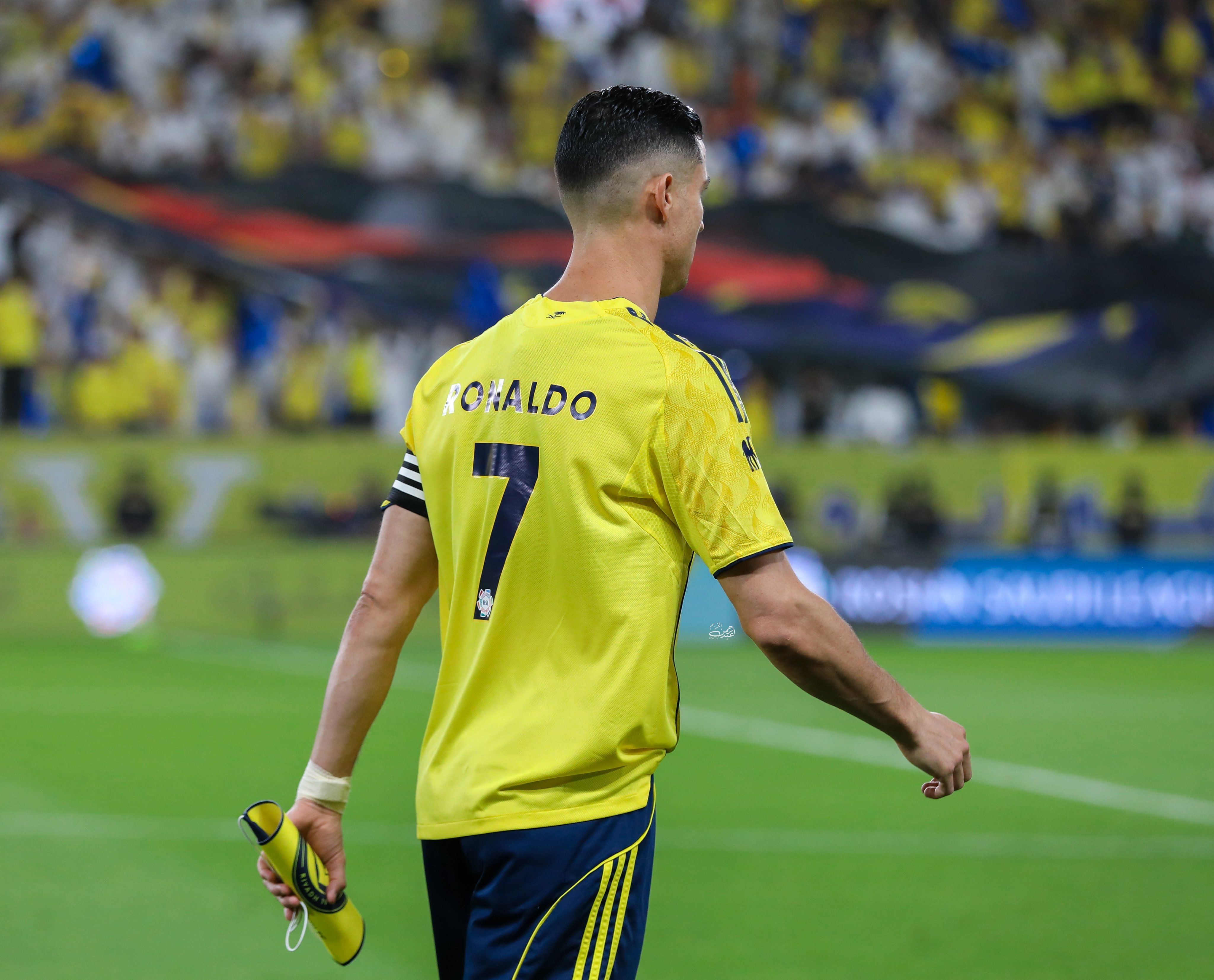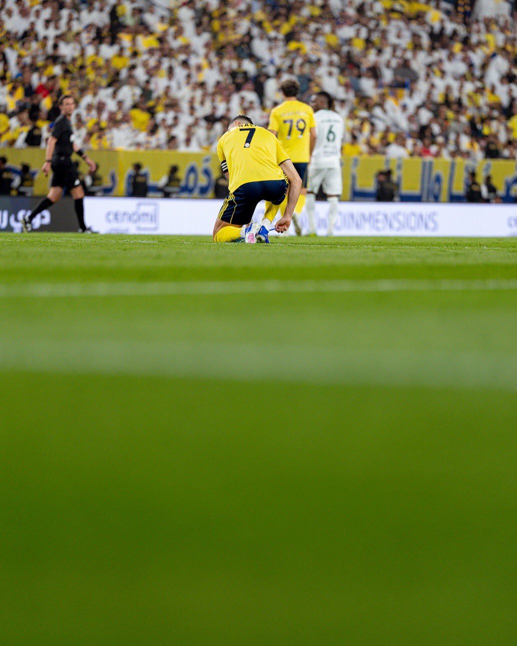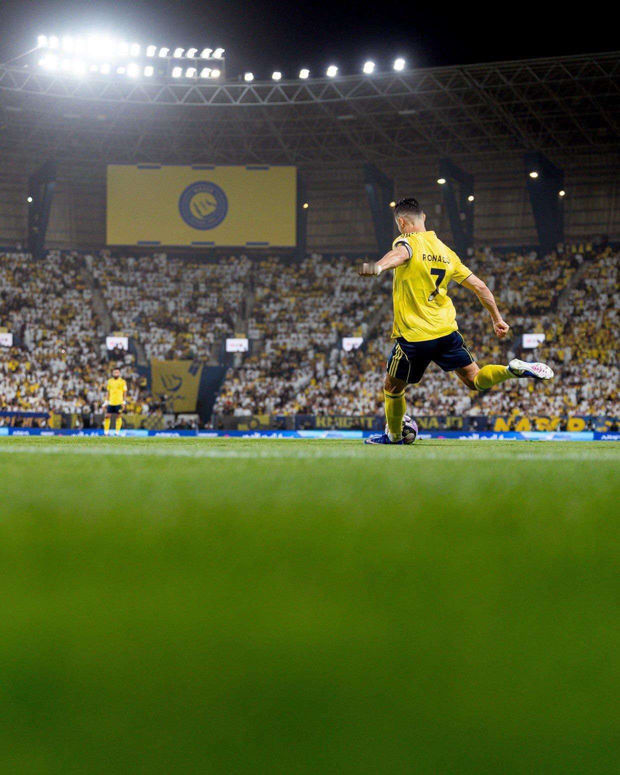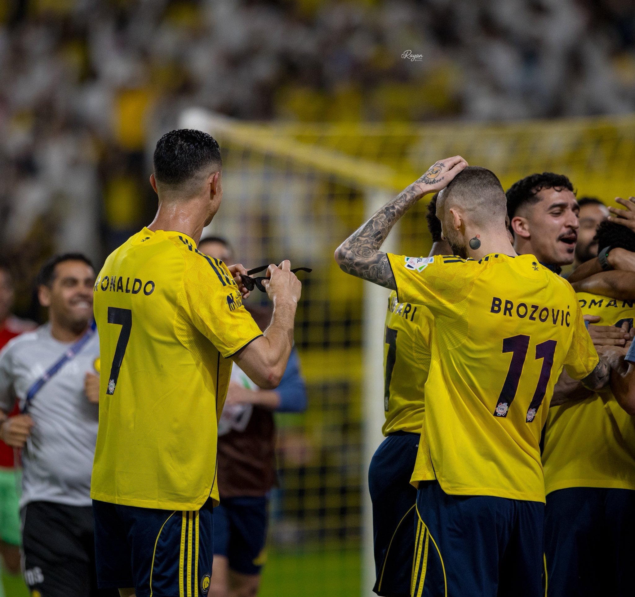 C罗利雅得胜利2比0吉达国民c罗生涯970球递墨镜给队友装酷捡水瓶环保达人头球弧