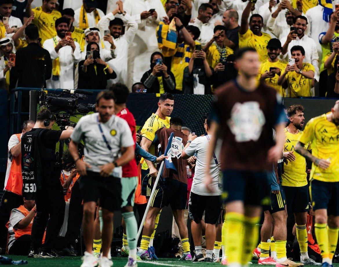 C罗利雅得胜利2比0吉达国民c罗生涯970球递墨镜给队友装酷捡水瓶环保达人头球弧线死角制造者