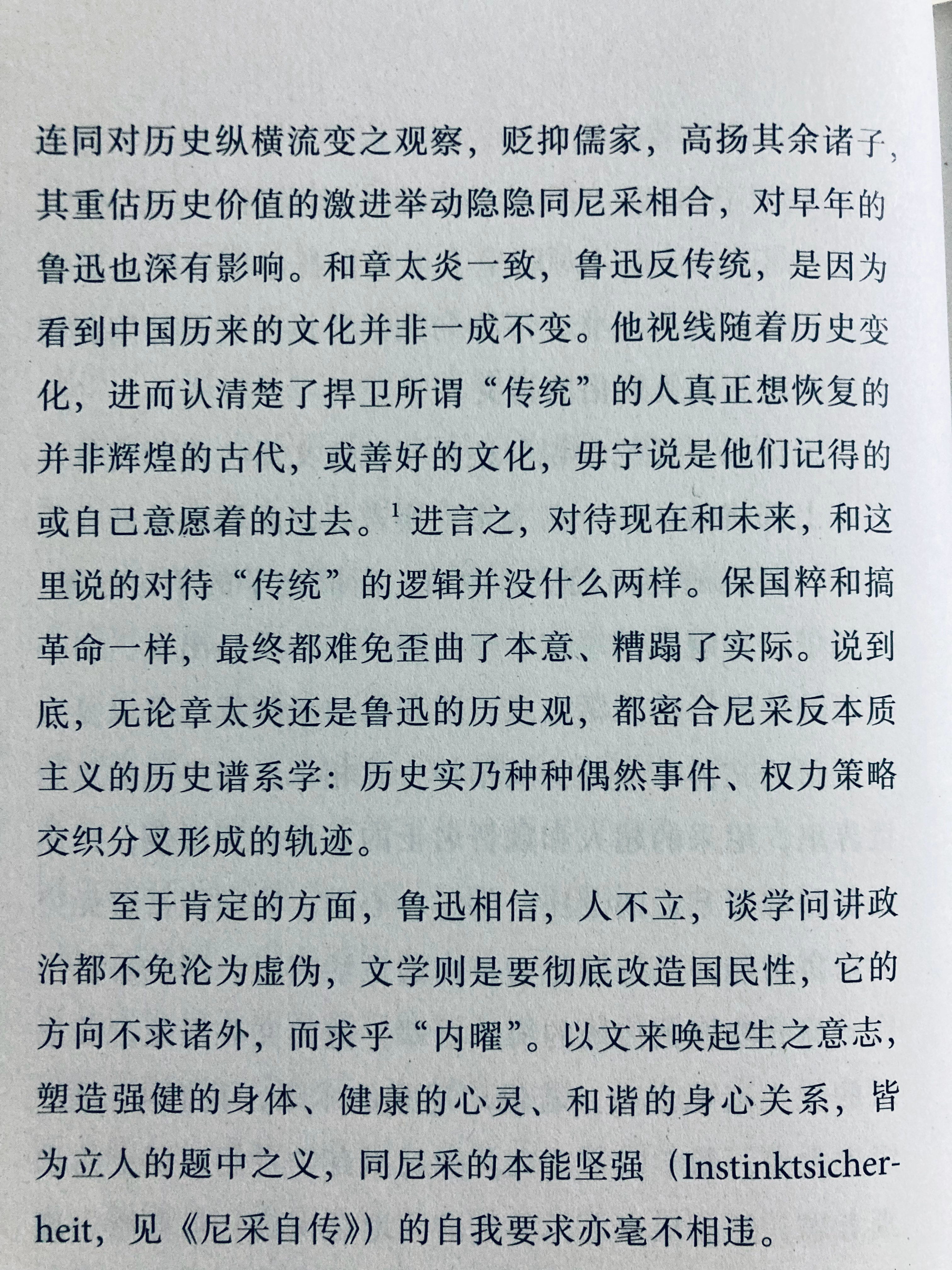和章太炎一致,鲁迅反传统,是因为看到中国历来的文化并非一成不变。他视线随着历史变化,进而认清楚了捍卫所谓“传统”的人真正想恢复的并非辉煌的古代,或善好的文化,毋宁说是他们记得的或自己意愿着的过去。进言之,对待现在和未来,和这里说的对待“传统”的逻辑并没什么两样。保国粹和搞革命一样,最终都难免歪曲了本意、糟蹋了实际。说到底,无论章太炎还是鲁迅的历史观,都密合尼采反本质主义的历史谱系学:历史实乃种种偶然事件、权力策略交织分叉形成的轨迹。(张巍卓《启明》)