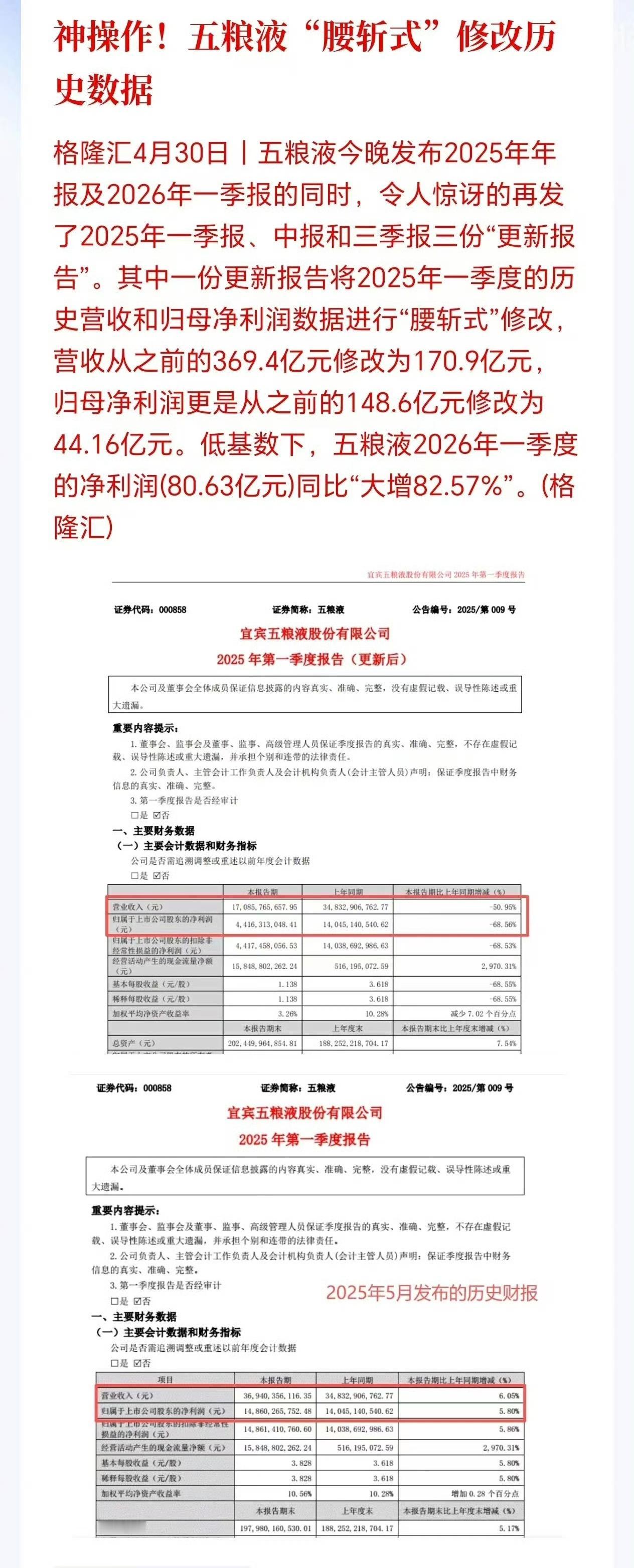 这是因为五粮液调整了2025年的同比基数,2025年一季度的净利润从148亿直接降到了44亿,这简直是断崖式的修改数据啊,也可以说是洗澡式的修改数据。二季度三季度的数据也都下调了。
