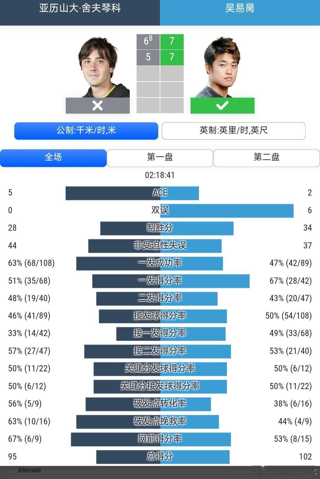 吴易昺🇨🇳7-6(8)/7-5战胜7号种子舍夫琴科🇰🇿,晋级8强,恭喜吴易昺!🎉🎉🎉