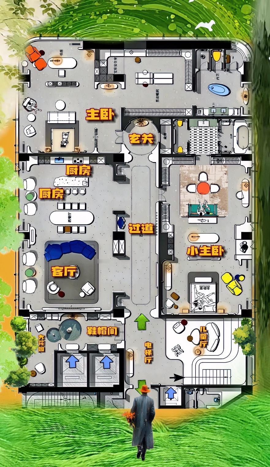 这751㎡出人头地,布局情商高,动线拼的天衣无缝!厅有菜味,卧有奢味,门口人情味。