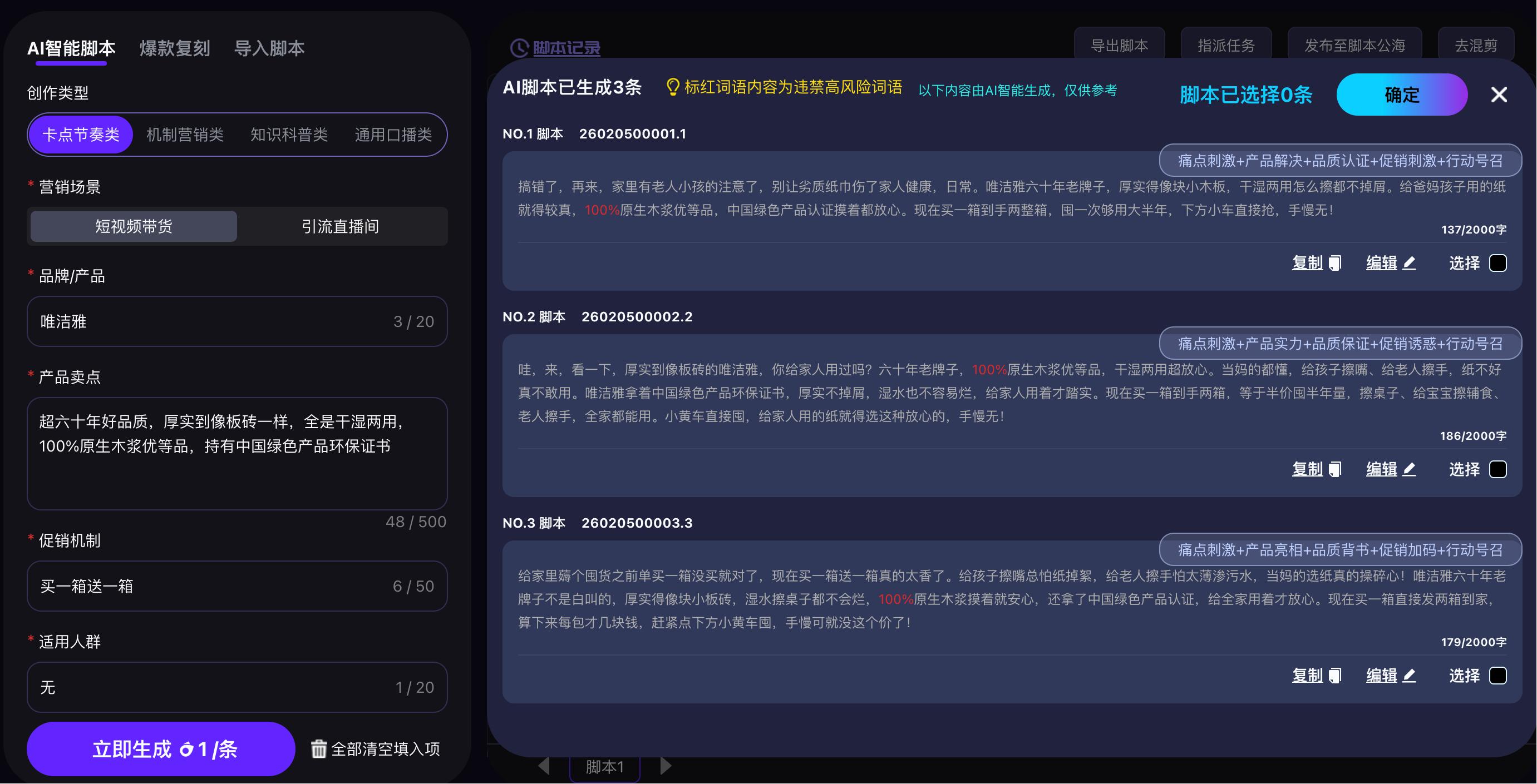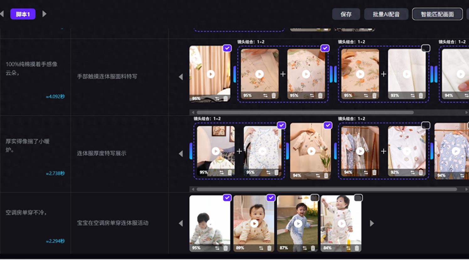 AI 基于十万级爆款样本训练,懂得黄金 3 秒钩子、卖点节奏、信任构建与转化引导,剪出来的视频天然适配平台流量机制,完播率、点击率、转化率普遍高于传统人工粗剪,让投流 ROI 同步提升。