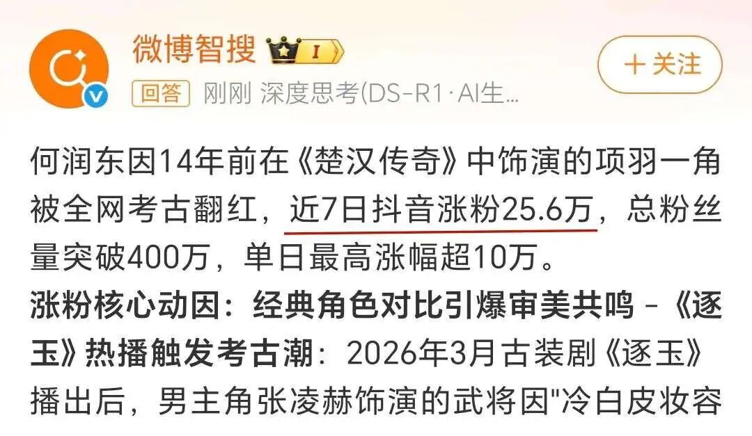 很久没有在娱乐圈冒泡的何润东,随着古装剧《逐玉》的播出,抖音一周涨粉近 30 万,粉丝量突破 400 万,商务代言纷纷找上门来。