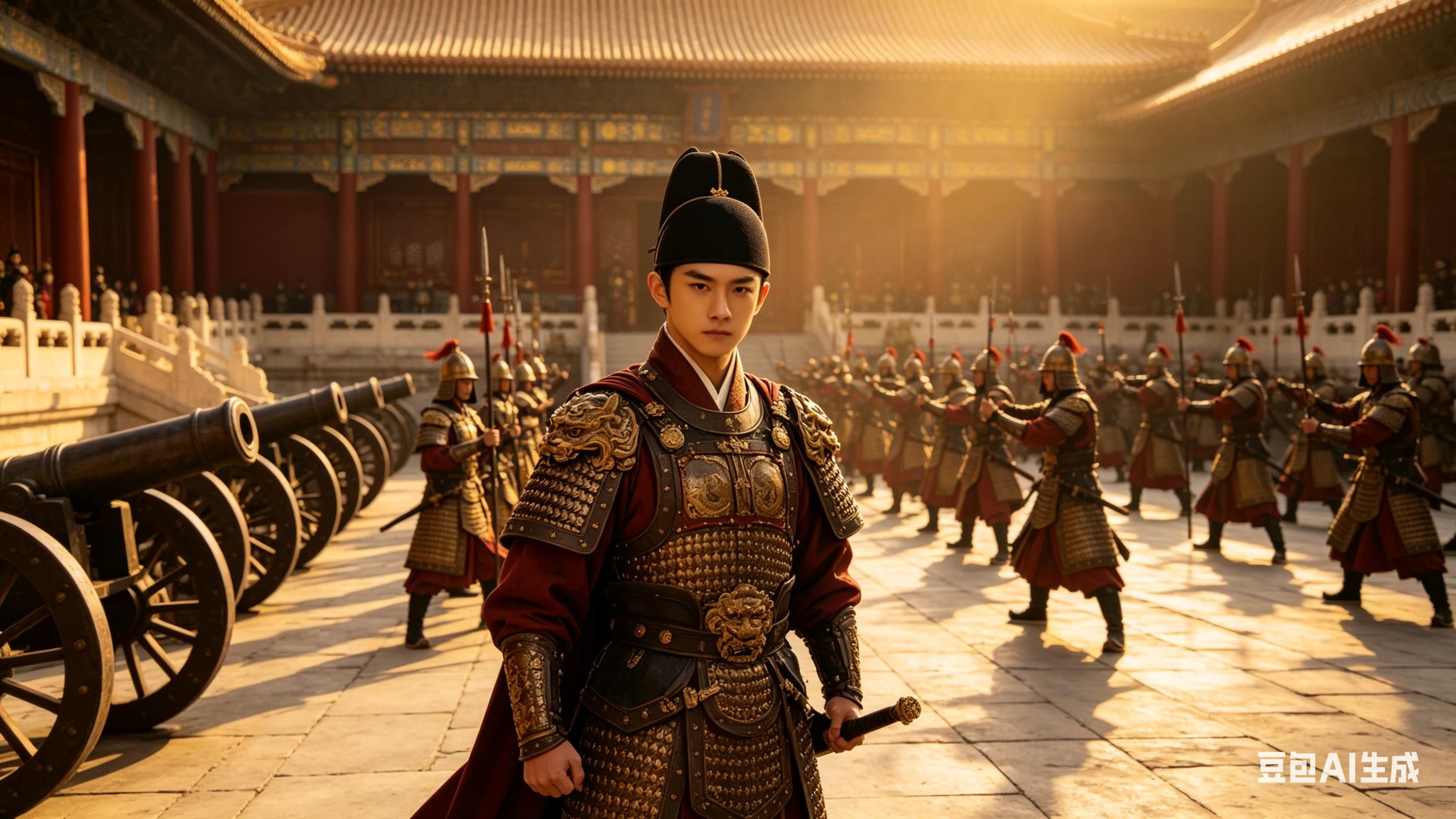设中军、外四家军,朱厚照身披铠甲、亲自操练,火炮声震天。