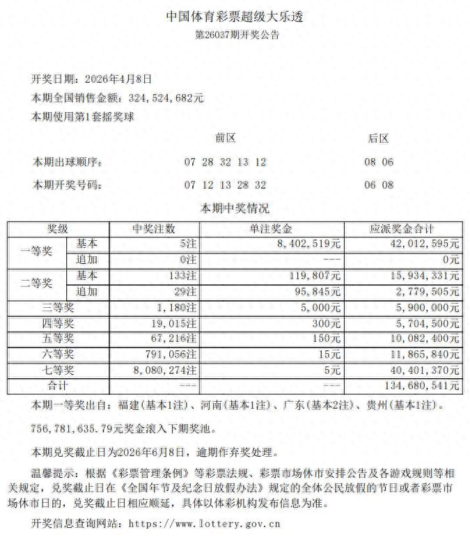 中国体育彩票超级大乐透如期开奖,2026年4月8日第26037期开奖,全国共出5注一等奖,单注奖金高达8402519元,由于没有触发封顶机制,这5注都拿到了最高的奖金。