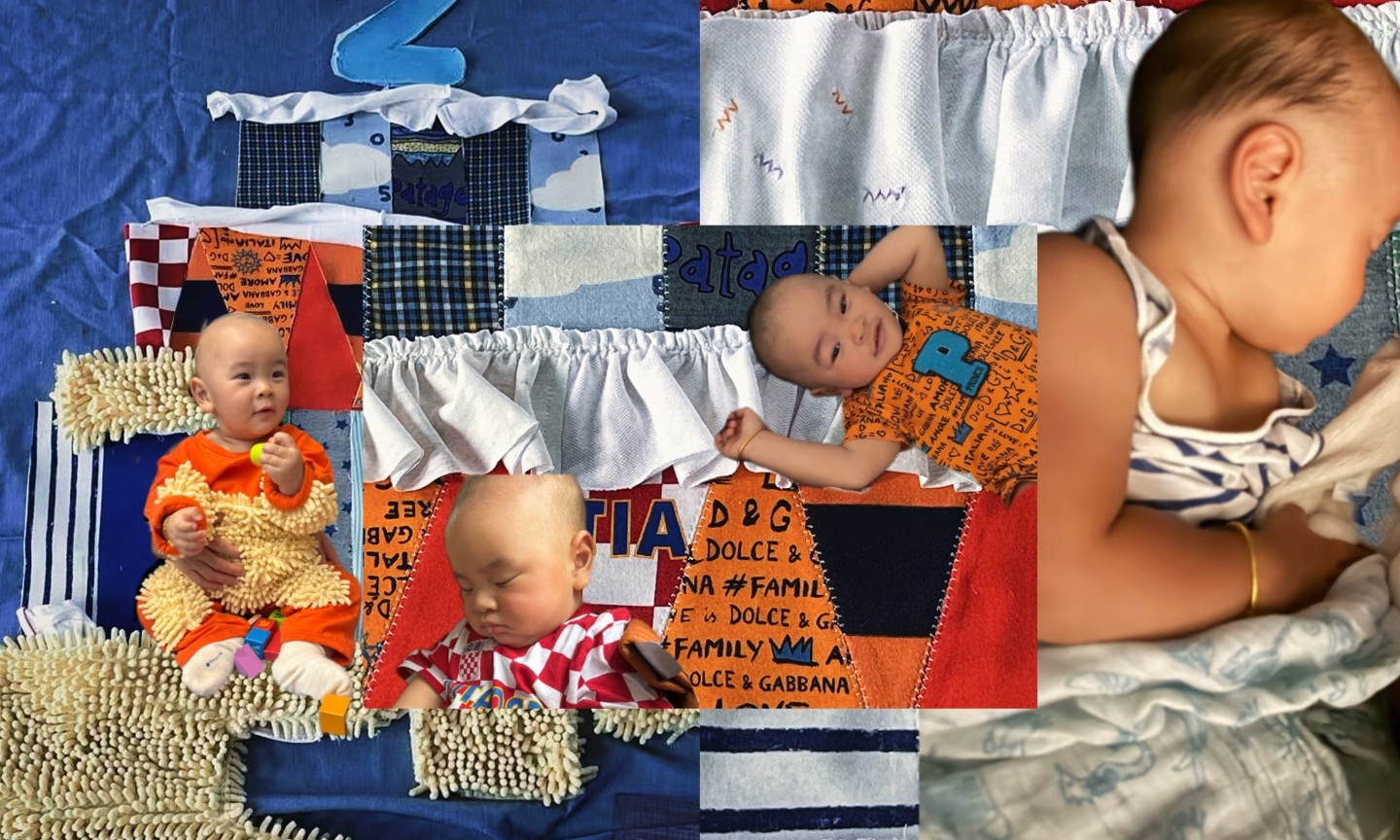 黄雅莉把儿子穿小了的衣服都洗得干干净净,然后剪成不同的形状铺在一块布上面,凑成了非常好看的款式。