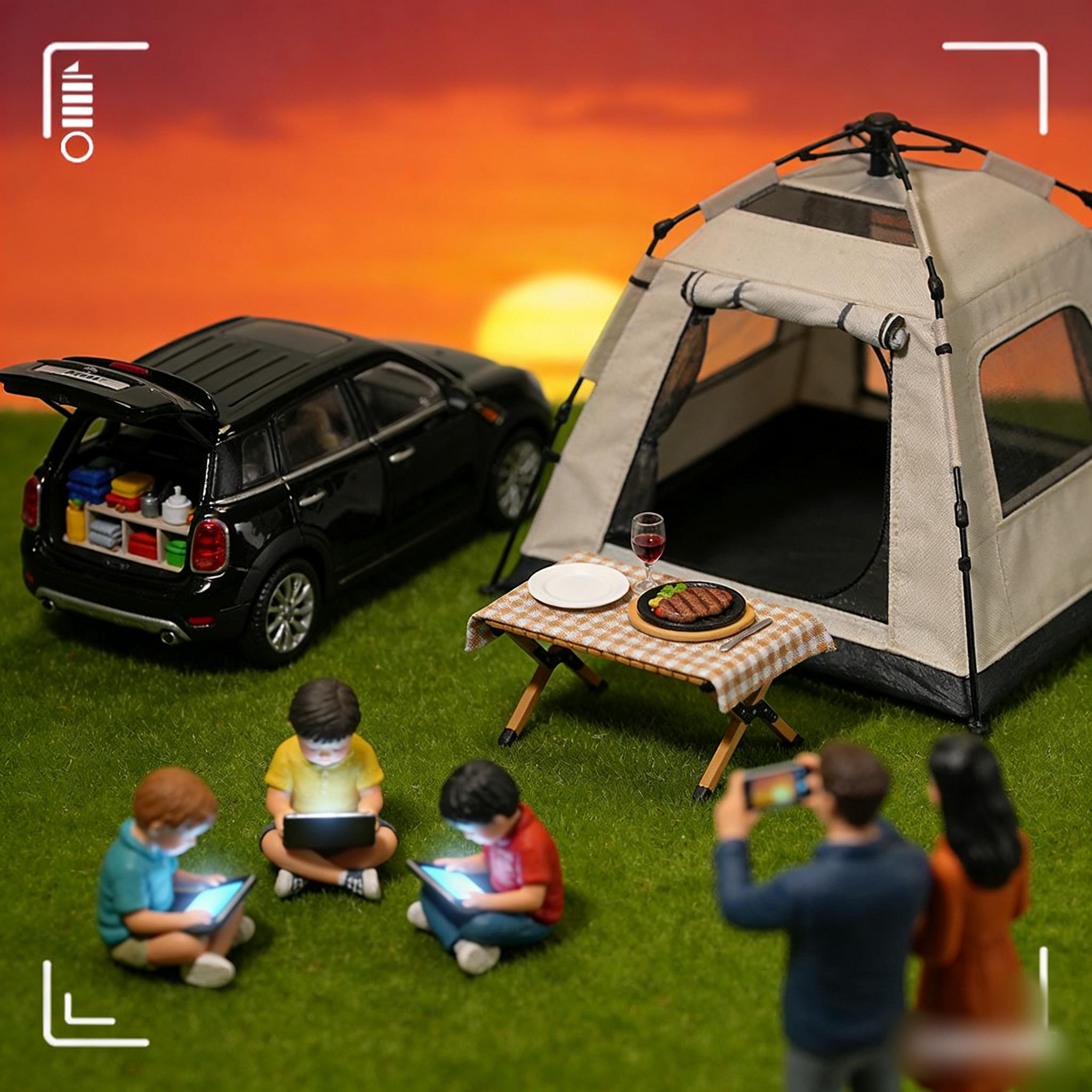 我们开车去郊外,车里放着舒缓的音乐,空调温度恰到好处。后备箱塞得满满当当,装着折叠桌椅、遮阳棚、蓝牙音箱。到了营地,支起帐篷,铺好防潮垫,一切都有条不紊。牛排煎得恰到好处,撒上黑胡椒和海盐,装在洁白的盘子里。孩子们在草地上奔跑,手里拿着iPad,偶尔拍几张照片发到朋友圈。我们举着红酒杯,对着夕阳拍照,滤镜调了很久,才按下快门。