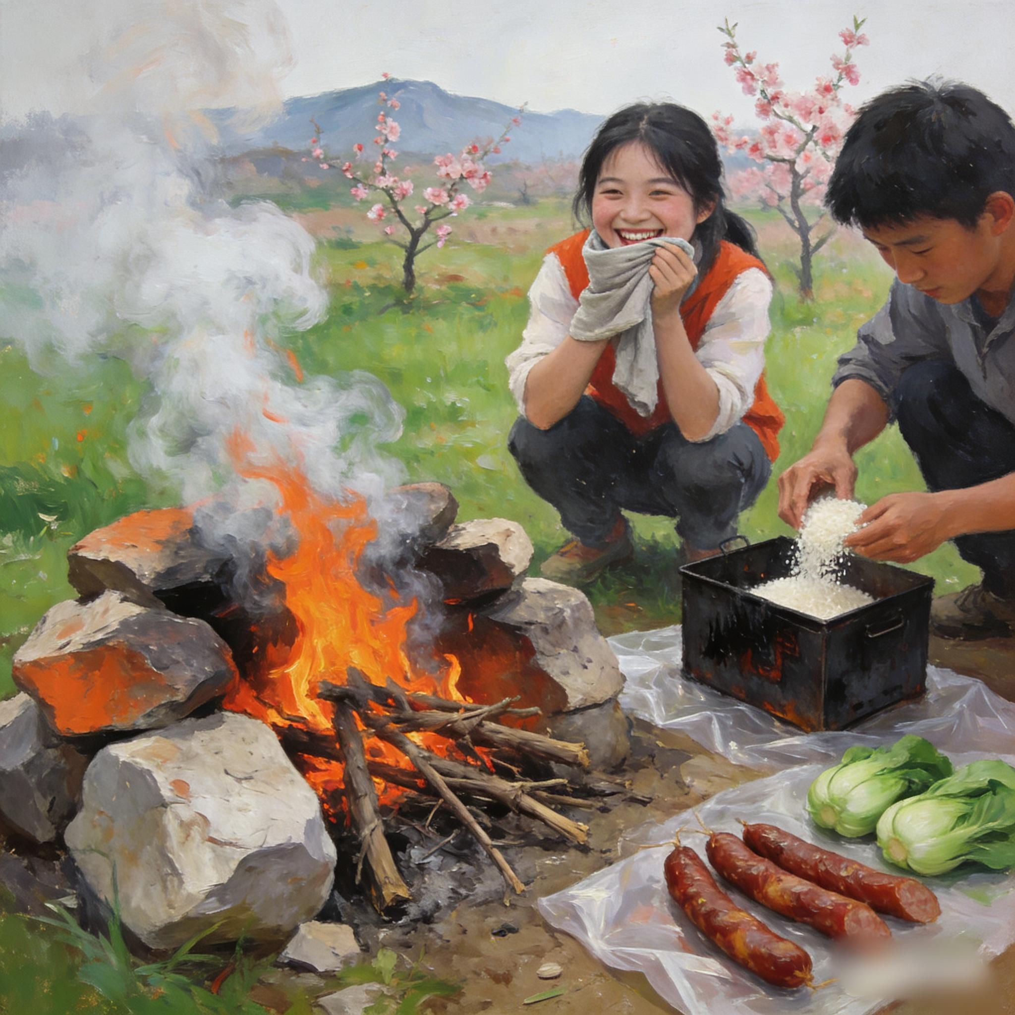 那真是些简陋的快乐。我们浩浩荡荡地走在田埂上,队伍拉得很长,像一列缓慢移动的火车。路边的紫云英开得正好,细碎的花朵连成一片紫色的雾。有人唱着刚学会的歌,调子跑得厉害,却没有人计较。到了目的地——通常是某个不知名的小山坡,或是一条清澈见底的小溪边——大家便忙着拾柴、垒灶。所谓的灶,不过是几块石头搭成的圆圈,中间架着拾来的干树枝。火柴划了好几根才点着,青烟呛得人流泪,却没有人抱怨。