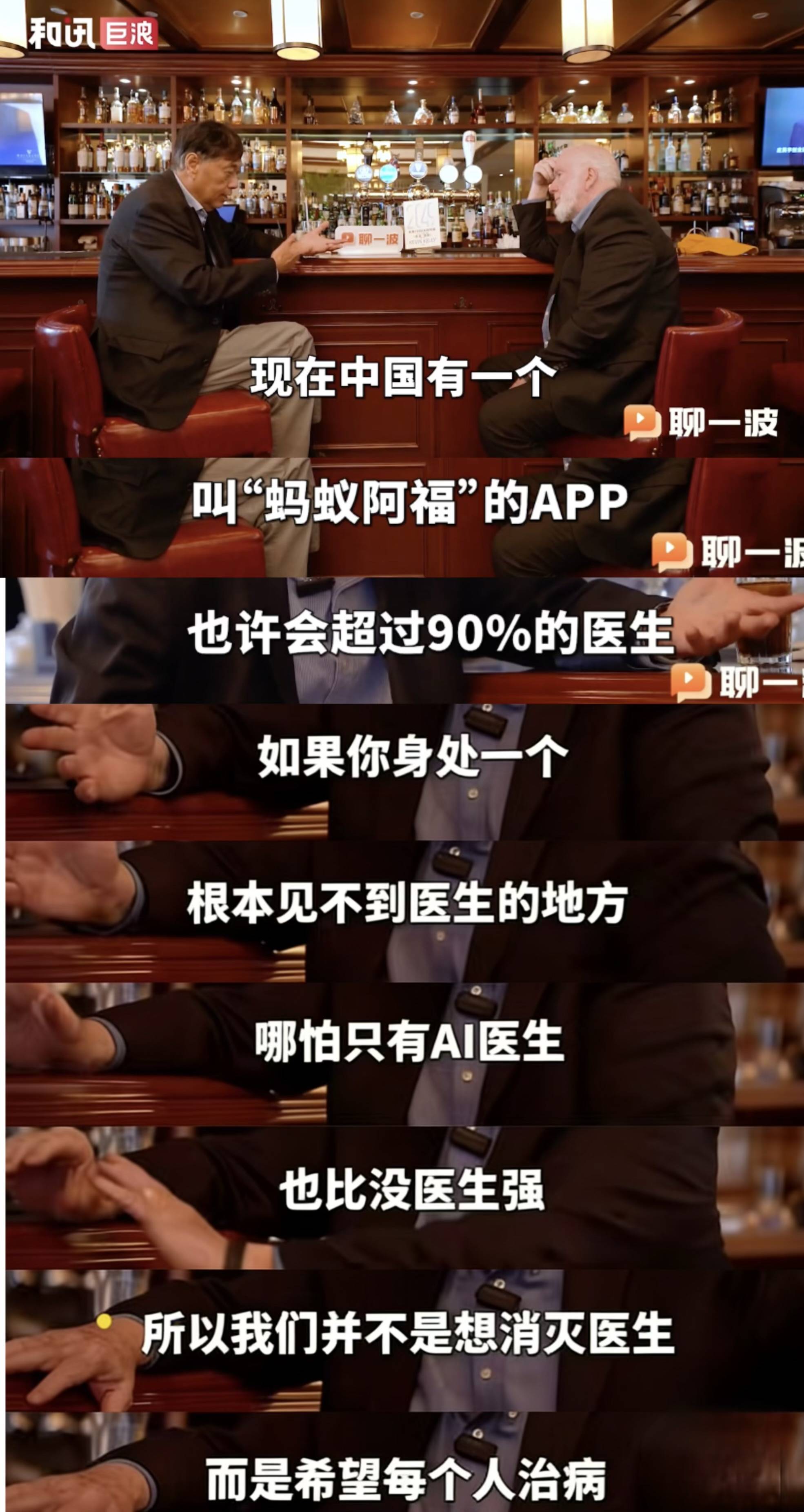 简单来说,老爷子认为,AI的发展并不会取代医生,因为很多地方医生都是稀缺的,而未来最好的医疗服务不会是纯AI,当然也不是纯医生,而是「AI+医生」这么个叠加组合。