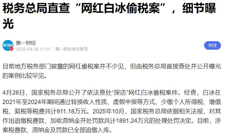 4月28日,国家税务总局发布官方通报,直接将这位头部网红的涉税违法行为全面曝光。经查实,白冰在2021年至2024年四年间,通过多种违法方式,少缴个人所得税、增值税、契税等各类税费共计911.18万元,最终被追缴税款、加收滞纳金并处罚款,三项合计金额高达1891.24万元,目前所有款项已全部追缴入库国家税务总局。