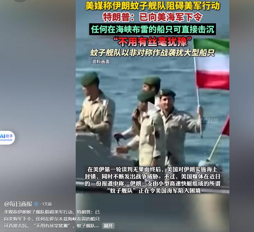 特朗普暴怒下"击沉令"伊朗"蚊子舰队"的持续袭扰,彻底激怒了特朗普。4月23日,他在TruthSocial平台上发出强硬指令,语气没有丝毫回旋余地:"我已下令美国海军,击沉并消灭任何在霍尔木兹海峡布设水雷的船只,不论多小,不得有任何犹豫条。"这条命令明确指向伊朗快艇,相当于给美海军开了"无限开火权",只要发现布雷行为,无需请示、直接开火。