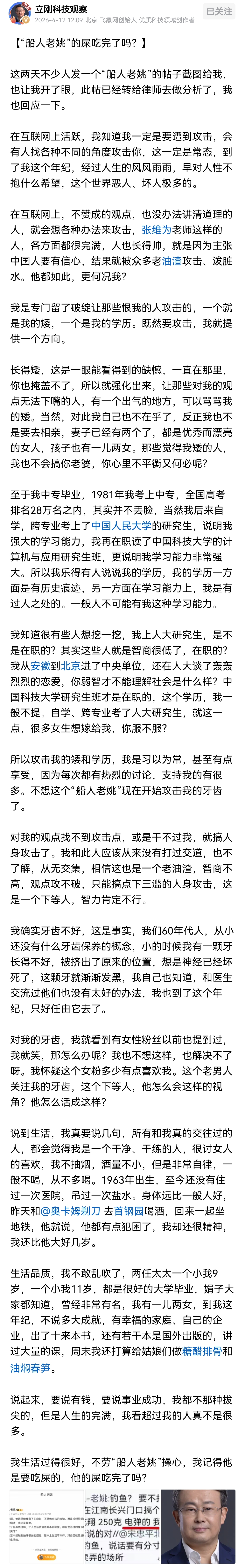 今天项立刚回应了“船人老姚”对自己攻击,他一方面说已经把截图转给了律师,另一方面也很勇敢的回应了自己的两个所谓的硬伤,一个是他的矮,一个是他的学历,很坦诚,也不回避。