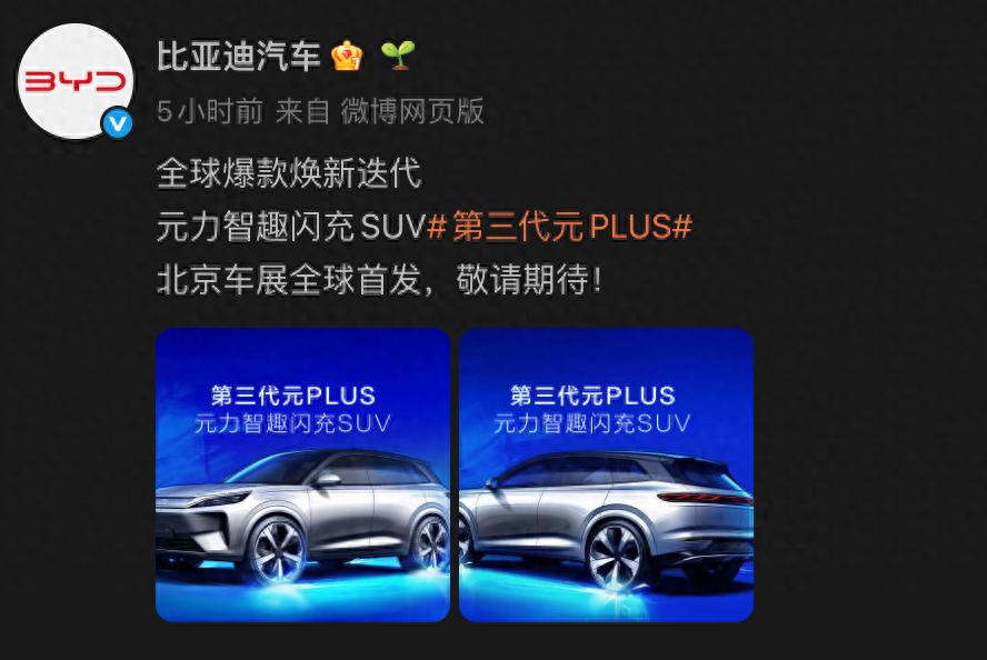 刚刚,比亚迪官宣,第三代元PLUS将于本届北京国际车展正式首发。新车定位紧凑型纯电SUV,基于后驱纯电平台打造,并全系标配闪充技术+第二代刀片电池。