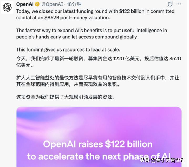 这是OpenAI刚刚完成的一轮融资,单轮融资,一次性,公司估值直接干到了8520亿美元。