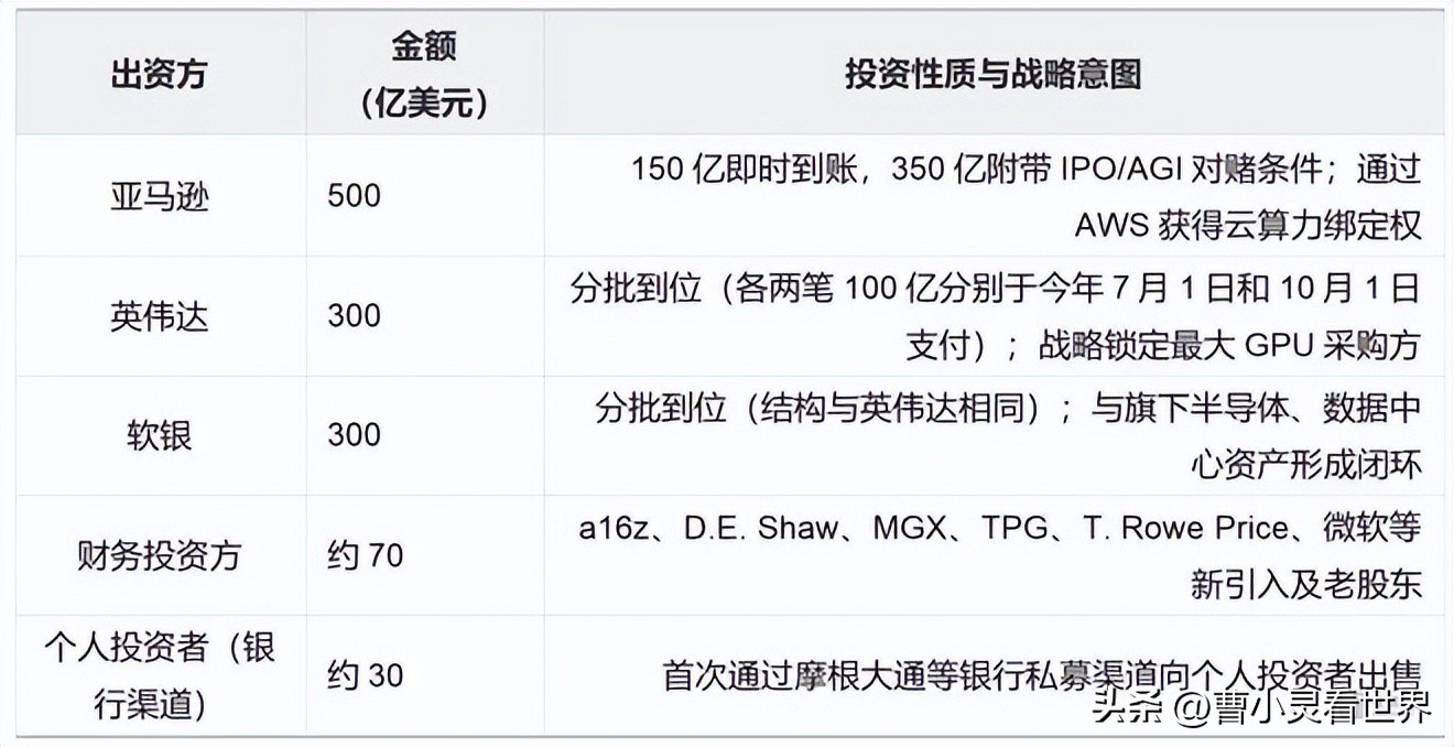而且不是一个人,是一群全球最聪明的钱,排着队买,亚马逊掏500亿美元,英伟达和软银集团各投资300亿美元,还有微软这样的老股东,再加上摩根大通通过私募渠道直接向个人投资者出售。